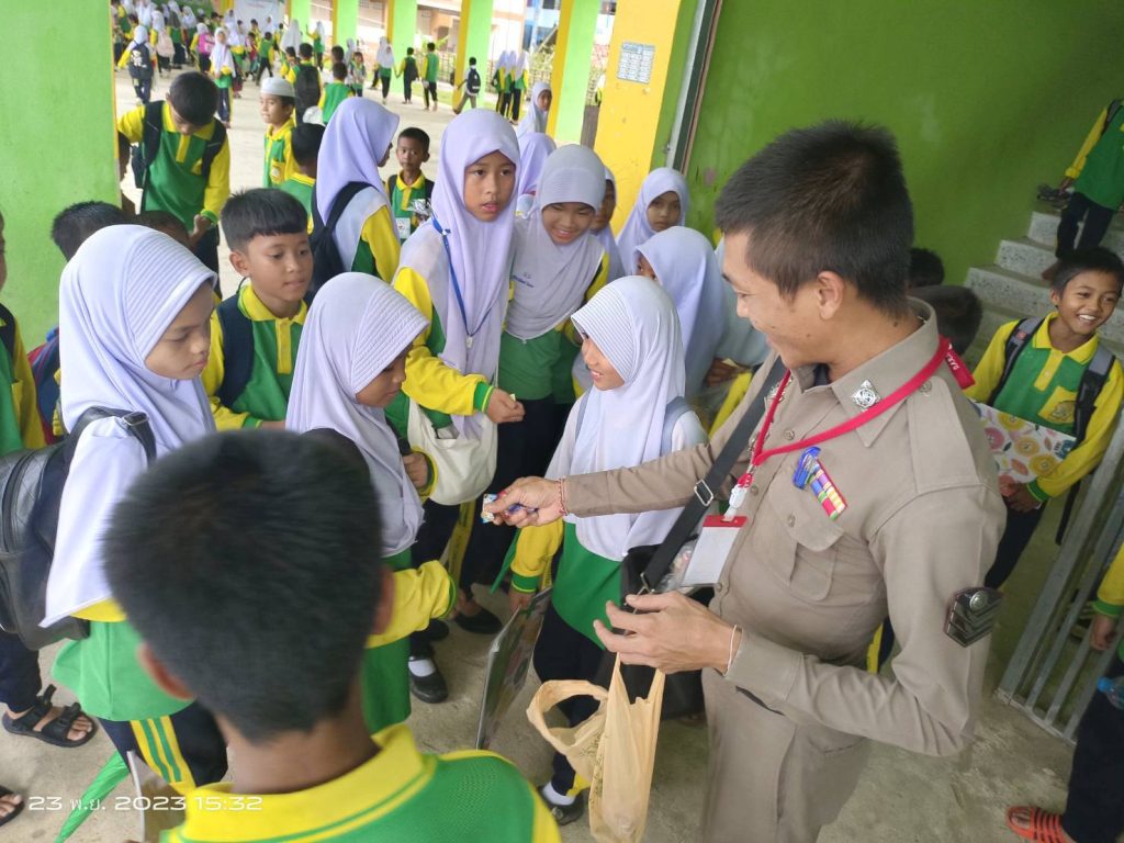 วันที่ 1 ก.พ. 67 เวลา 14.30 – 15.30 น. ภายใต้อำนวยการของ พ.ต.อ.ภัควัฒน์ วันสนุก ผกก.สภ.ศรีสาคร พ.ต.ท.วรภัทร์ พึ่งเดช รอง ผกก.ป.สภ.ศรีสาคร ร.ต.ต.ศรายุธ กองแก้ว ผบ.มว.นปพ.นราธิวาส 23 มอบหมายให้ ส.ต.อ.ยุทธนา ศรีสุวรรณ ผบ.หมู่ (ป.) สภ.ศรีสาคร พร้อมด้วย ส.ต.อ.สุเมธ เกสโร ผบ.หมู่ (นปพ.) สภ.ศรีสาคร ครูตำรวจแดร์ ( D.A.R.E. ) เข้าทำการสอน หลักสูตร แดร์ ประเทศไทย (โครงการ การต่อต้านการใช้ยาเสพติดในเด็กนักเรียน) ประจำภาคเรียนที่ 2 ปีการศึกษา 2566
