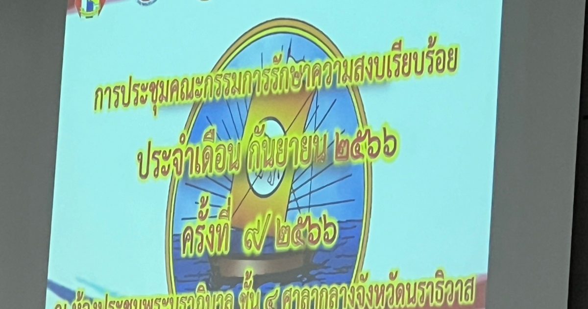 ประชุมรักษาความสงบเรียบร้อยจังหวัดนราธิวาส 28 กันยายน 2023 โดย srisakhon_ssk / ข่าวภารกิจผู้บังคับบัญชา เมื่อวันที่ 27 กันยายน 2566 เวลา 14.00 น. ว่าที่ พ.ต.อ.ภัควัฒน์ วันสนุก ผกก.สภ.ศรีสาคร เข้าร่วมการประชุมการประชุมคณะกรรมการรักษาความสงบเรียบร้อย ประจำเดือนกันยายน 2566 ครั้งที่ 9/2566 โดยมี นายสังคม เกิดก่อ ปลัดจังหวัดนราธิวาสเป็นประธานการประชุม ณ ห้องประชุมนราภิบาลชั้น4 ศาลากลางจังหวัดนราธิวาส