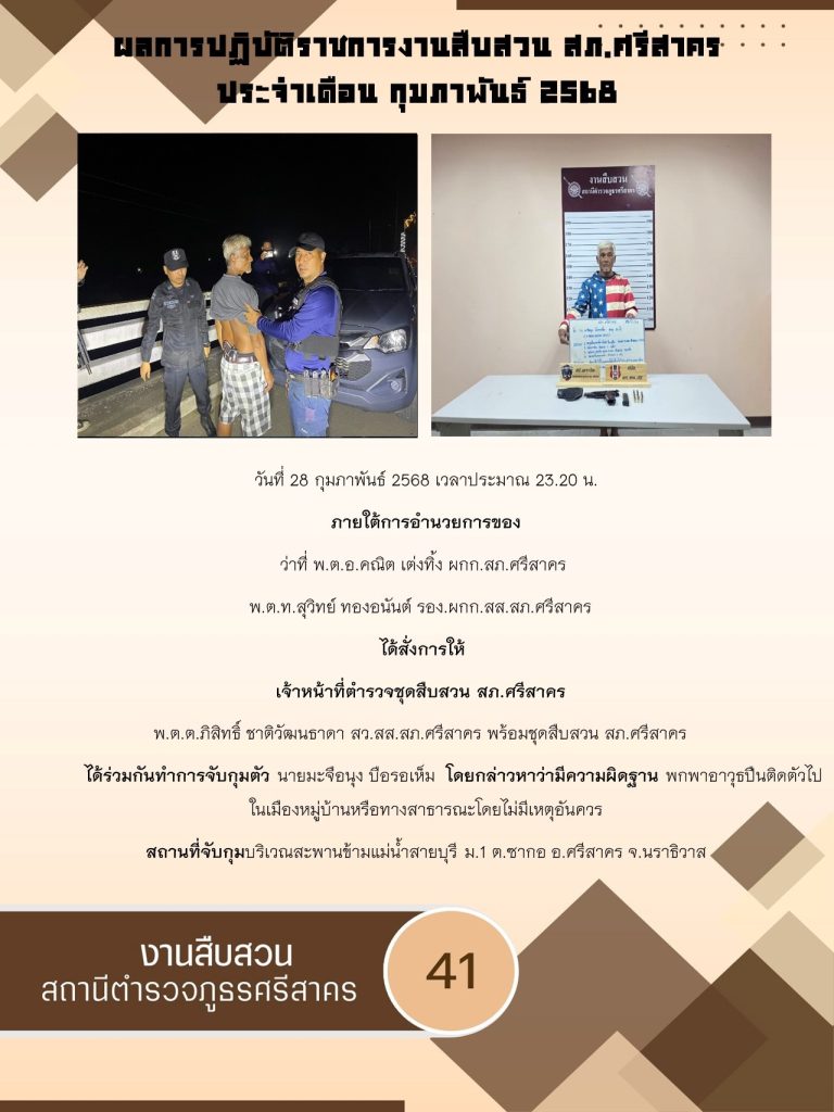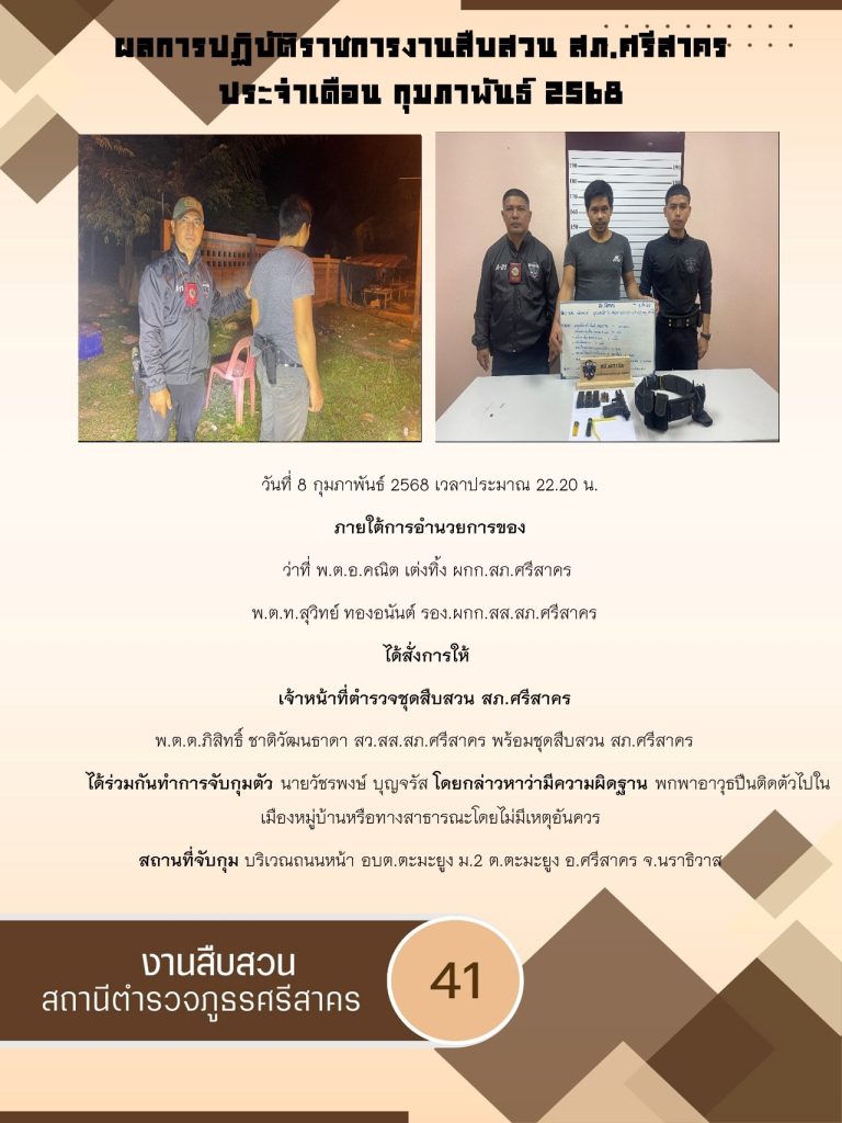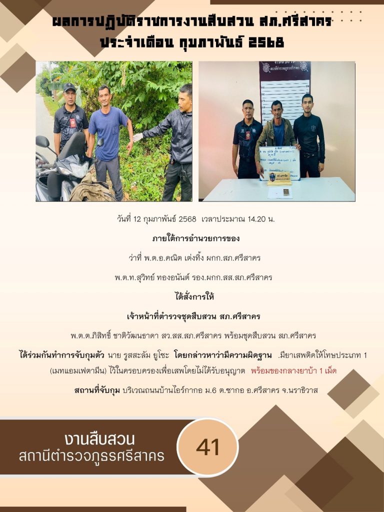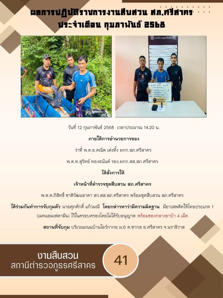 ผลการปฏิบัติ งานสืบสวน ประจำเดือนกุมภาพันธ์ 2568 3 มีนาคม 2025 โดย srisakhon_ssk / ข่าวประชาสัมพันธ์,งานสืบสวน,ไม่มีหมวดหมู่
