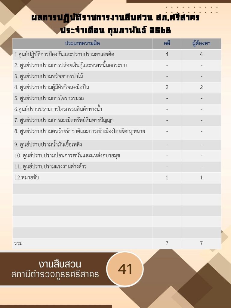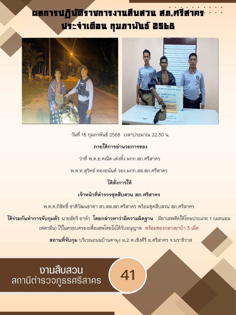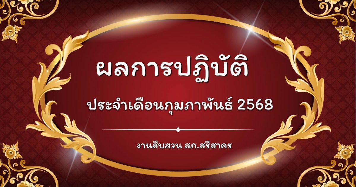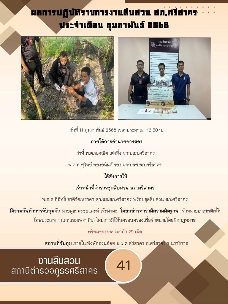 ผลการปฏิบัติ งานสืบสวน ประจำเดือนกุมภาพันธ์ 2568 3 มีนาคม 2025 โดย srisakhon_ssk / ข่าวประชาสัมพันธ์,งานสืบสวน,ไม่มีหมวดหมู่