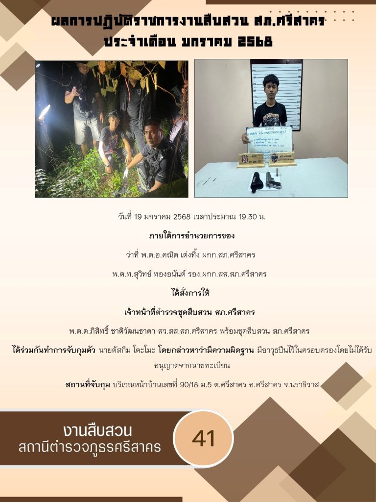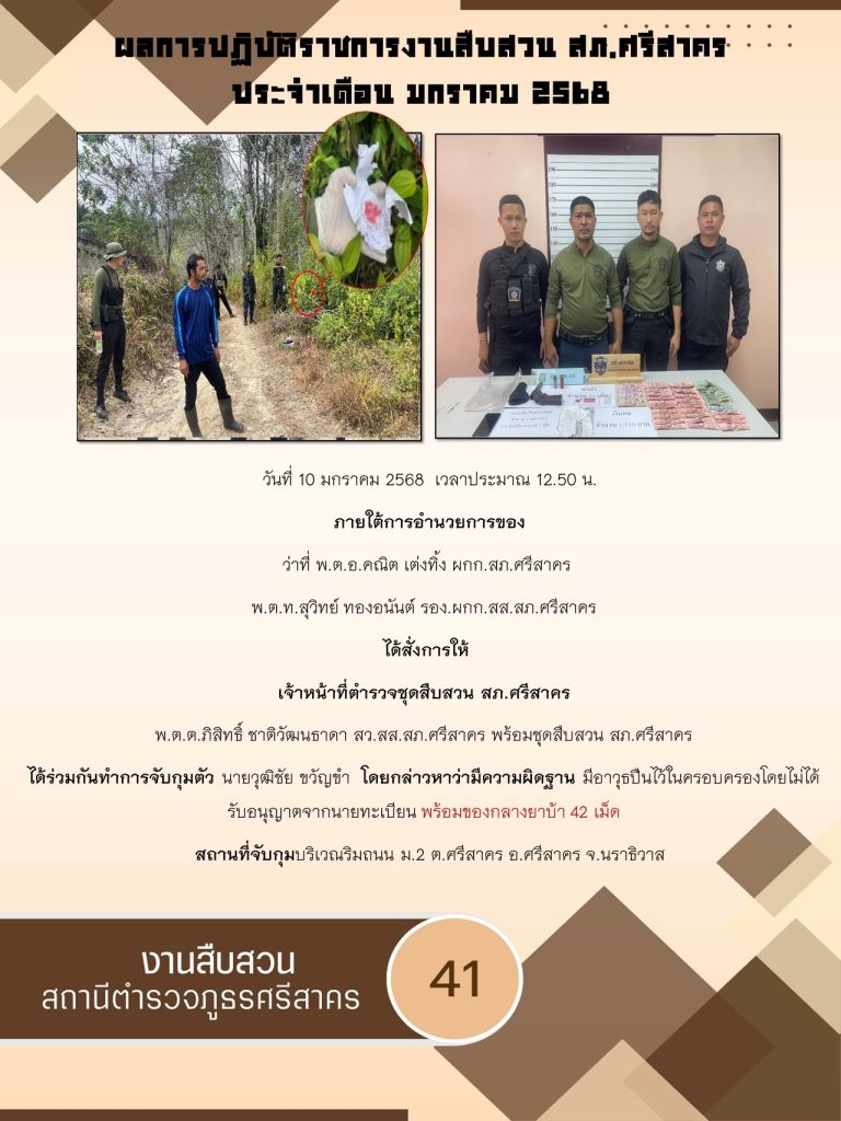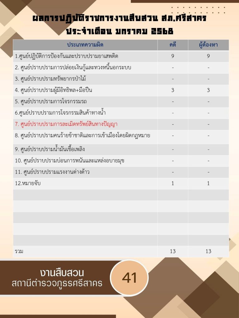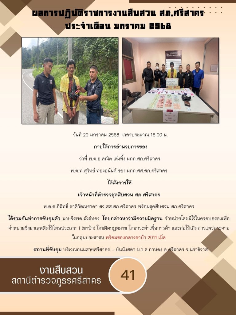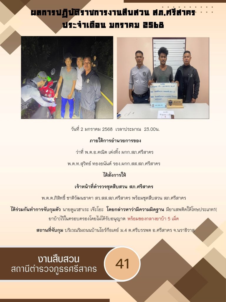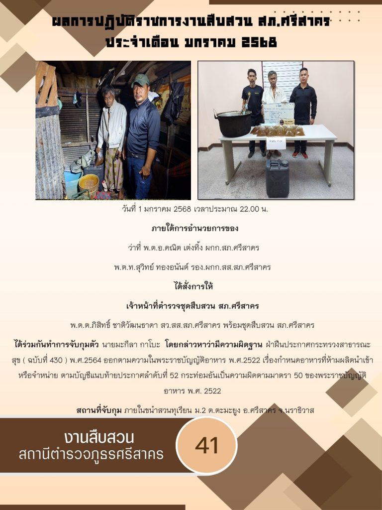 ผลการปฏิบัติ งานสืบสวน ประจำเดือนมกราคม 2568 5 กุมภาพันธ์ 2025 โดย srisakhon_ssk / ข่าวประชาสัมพันธ์,งานสืบสวน